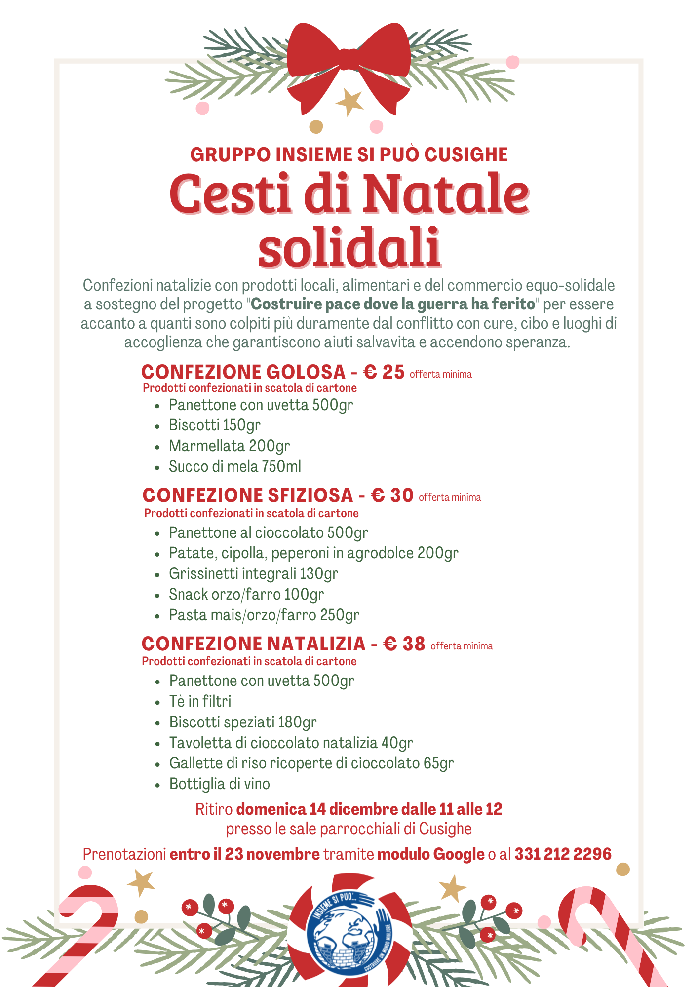 Sia per i privati che per le aziende, anche quest’anno abbiamo creato delle proposte solidali che racchiudono un misto di prodotti alimentari a chilometro zero di produttori agricoli e cooperative del territorio (panettone, vino, miele, biscotti, succhi…), grazie anche alla collaborazione con Confcooperative Belluno e Treviso, insieme ad alcuni del circuito del commercio equo-solidale (caffè, cioccolata, tè e tisane). Tutto il ricavato della distribuzione delle ceste è a sostegno del progetto di Natale.