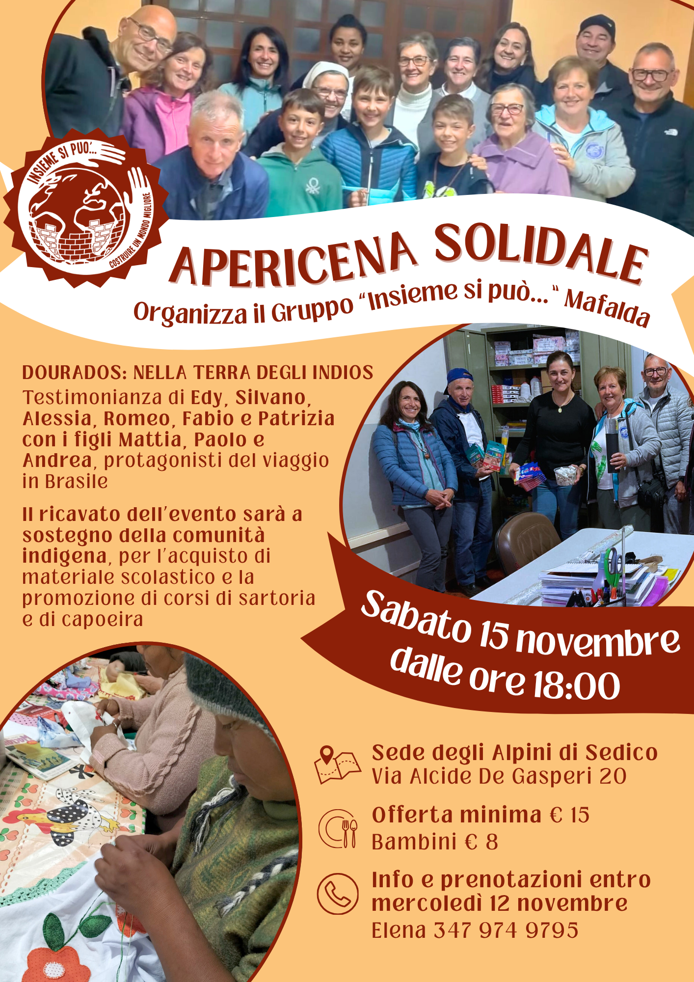 SABATO 15 NOVEMBRE alle ore 18:00 vi aspettiamo nella sede degli Alpini di Sedico per una serata di solidarietà per la comunità indigena di Dourados, in Brasile. I racconti e le testimonianze di Edy, Romeo, Alessia, Silvano, Fabio e Patrizia con i figli Mattia, Paolo e Andrea ci porteranno alla scoperta di questa realtà. A seguire una deliziosa apericena.